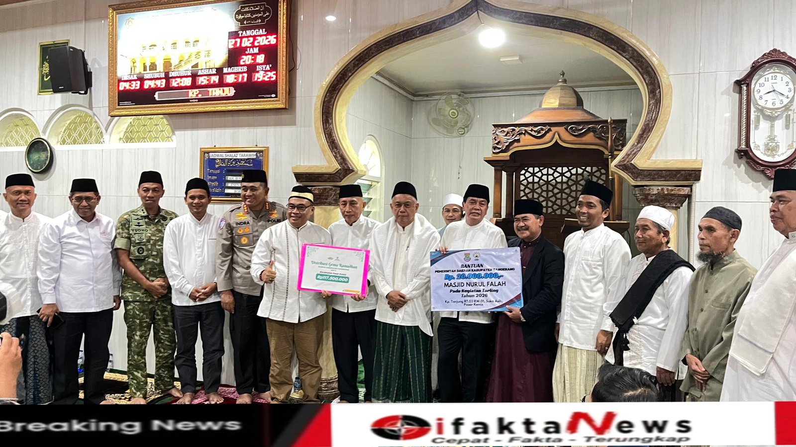Komitmen tersebut diperkuat melalui penyerahan bantuan pembangunan masjid sebesar Rp20 juta dari Pemerintah Kabupaten Tangerang dan Rp117,5 juta dari Kecamatan Pasar Kemis. Total dukungan Rp137,5 juta itu diharapkan memperkuat fasilitas ibadah sekaligus aktivitas sosial masyarakat sekitar.