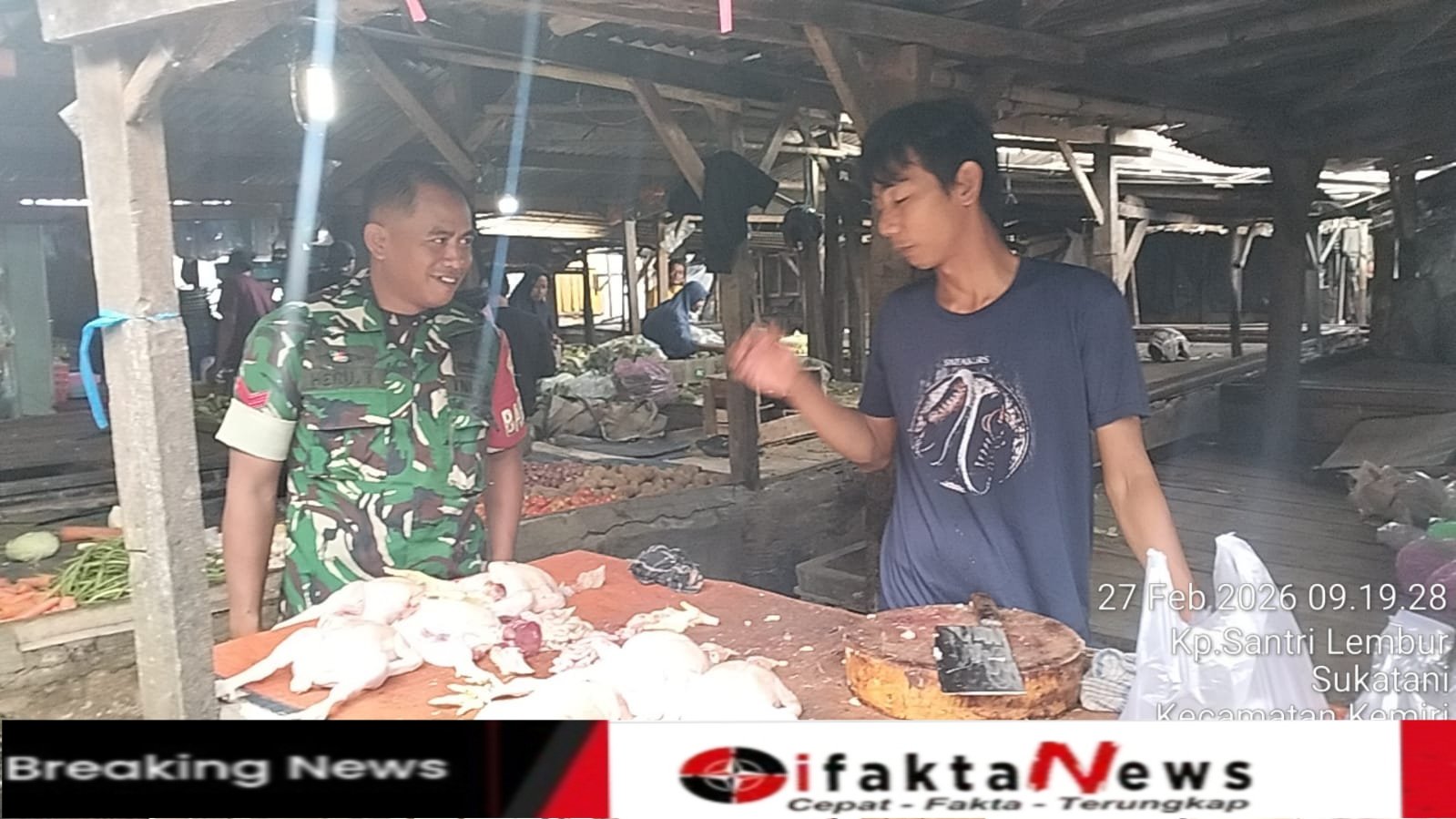 ifaktanews.id – Kodam Jaya, Tigaraksa – Babinsa Koramil 12/Rajeg, Kodim 0510/Trs Koptu Madrubi dan Koptu Heru Triana melaksanakan pengecekan dan pemantauan harga kebutuhan pangan di pasar tradisional Pasar Kukun Jalan Irigasi Kampung Kukun Kelurahan Sukatani, Kecanatan Rajeg, Kabupaten Tangerang, Jum’at (27/02/2026).