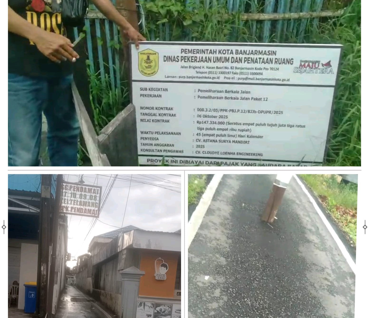Melihat Papan Pengumuman yang berisikan informasi sub kegiatan pekerjaan pemeliharaan berkala Jalan paket 12 diketahui dilaksanakan oleh Dinas PUPR Kota Banjarmasin dan dijalankan oleh Bidang Jalan & Jembatan yang dikerjakan penyedia CV. ASTANA SURYA MANDIRI, dan konsultan pengawas CV. CLOUDYE LOENHA ENGINEERING. dalam jangka waktu pelaksanaan 45 (empat puluh lima) Hari Kalender. Dengan total nilai kontrak sebesar Rp.147.334.000 (Seratus empat puluh tujuh juta tiga ratus tiga puluh empat ribu rupiah).