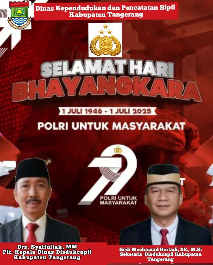 ifaktanews.id – Kabupaten Tangerang  Plt. Kepala Dinas, Drs. Syaifullah, MM dan Sekretaris Dinas, Hedi Mochamad Hertadi, SE., M.Si serta  segenap Jajaran di Dinas Kependudukan dan Catatan Sipil (Dukcapil) Kabupaten Tangerang mengucapkan Selamat Hari Bhayangkara atau Hari Jadi Korps Polisi Republik Indonesia (Polri) ke-79.
