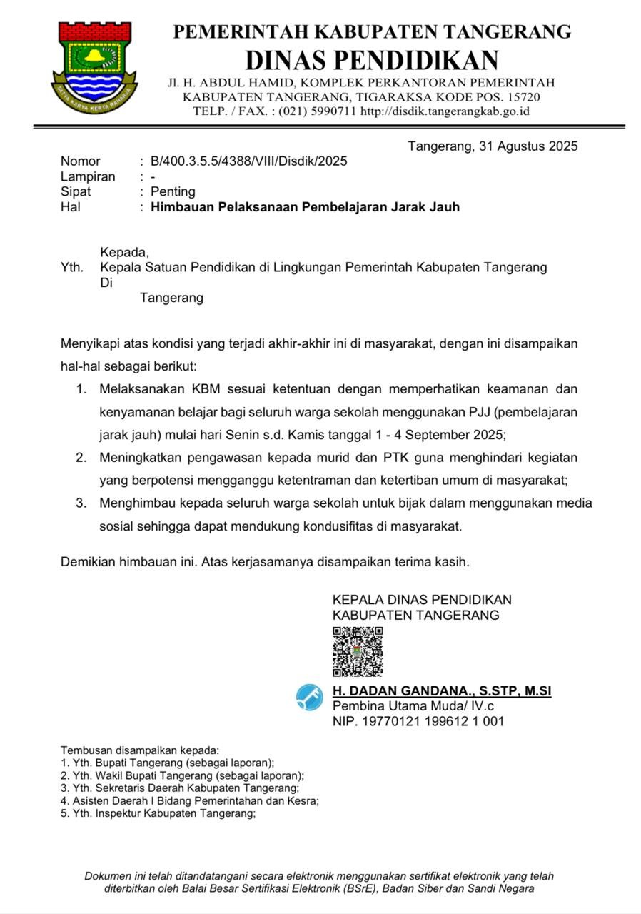 ifaktanews.id – Tangerang, Bupati Tangerang Moch. Maesyal Rasyid Melalui Dinas Pendidikan  H. Dadan Gandana, S.STP., M.Si sebagai Kepala Dinas Mengeluarkan Maklumat Himabauan Pelaksanaan Pelajar Jarak Jauh ( PJJ)